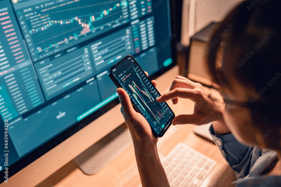Closeup - Woman is checking Bitcoin price chart on digital exchange on smartphone, cryptocurrency future price action prediction.