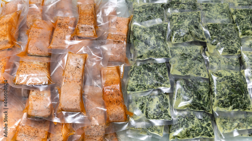freeze cooked salmon and cheesy creamed spinach in vacuum plastic packs, concept of food preservation, good work from home lunch idea, quick food on busy day, time-saving meal for lockdown period