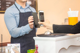 People using smartphone mobile banking scan QR code to pay in shop