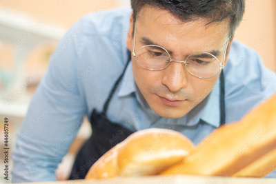 shop owner is checking the quality of the bread before selling it to the customers. Small business quality control