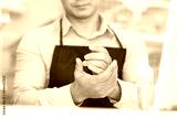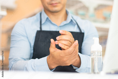 Employee using alcohol gel cleaning hand for working in coffee shop