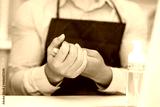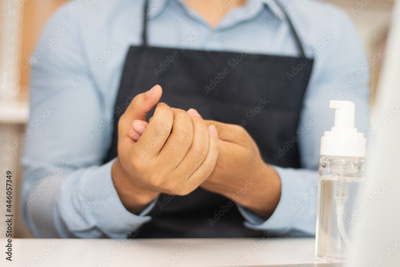 Employee using alcohol gel cleaning hand for working in coffee shop
