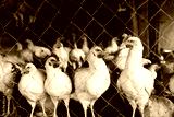 Chickens are white on the poultry farm behind the net. Development of animal husbandry and farming. Young poultry.