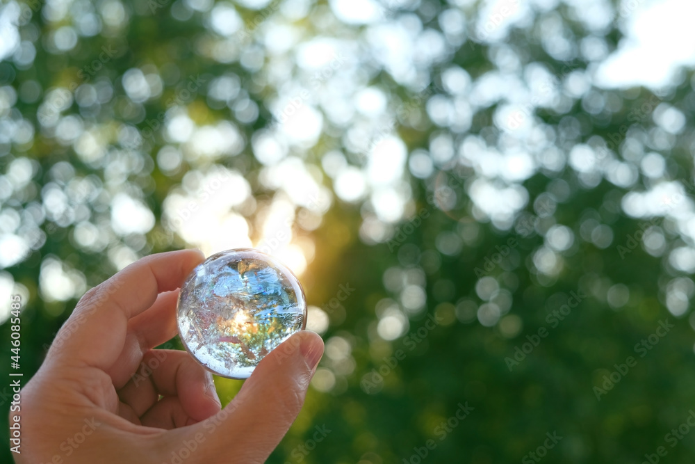 Clear quartz crystal ball in hand, natural green background. Esoteric spiritual practice. Mysticism, divination, modern wicca occultism concept. Chakra Relaxation, Wiccan Witchcraft ritual