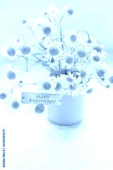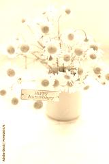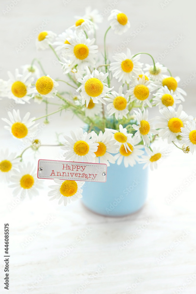 Happy anniversary greeting card with chamomile flowers bouquet on white background. floral gift