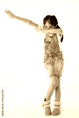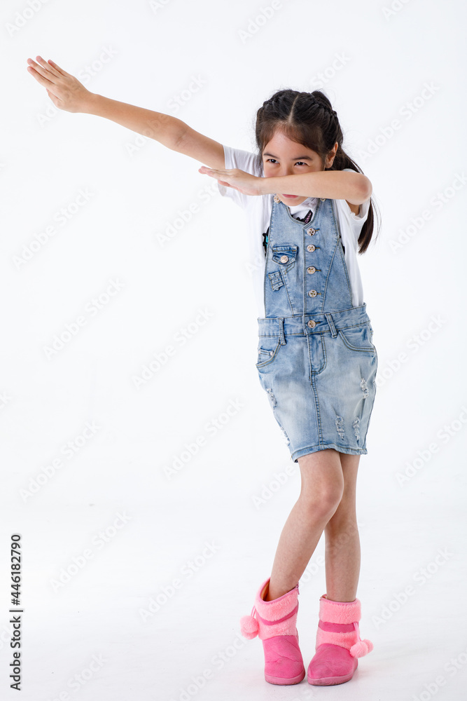 Portrait isolated studio shot of young pretty cute long hair girl in jeans denim skirt overalls with pink boots standing hold hands up posing dab celebration gesture in front of white background