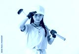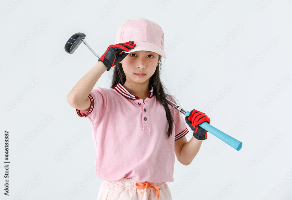 Portrait close up isolated studio shot of Asian little professional girl kid golfer in pink athlete fashion clothing red gloves and cap stand look at camera touch brim and put putter across shoulder