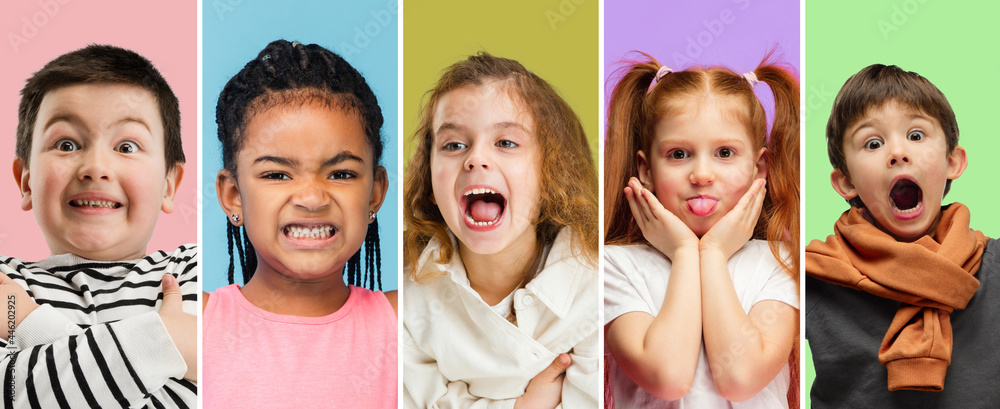 Collage made of portraits of little cute kids, boys and girls isolated on multicolored studio background. Human emotions, facial expression, childhood concept