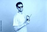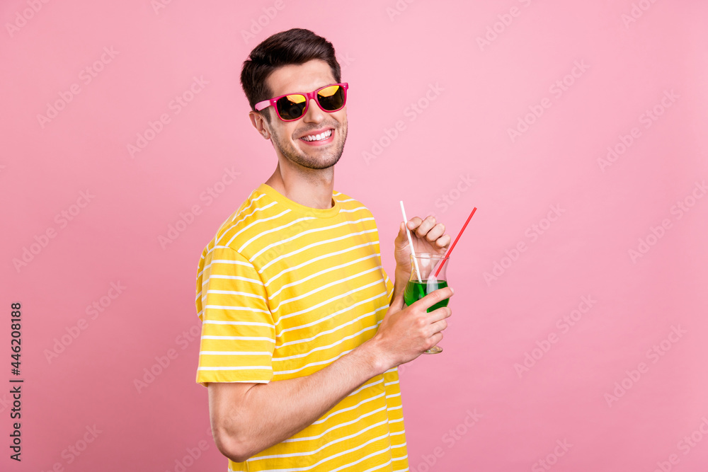 Profile side view portrait of attractive cheerful guy drinking beverage having fun chill isolated over pink pastel color background