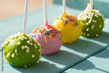 Multicolored candy or cake on a stick on a white background. A beautiful dessert.