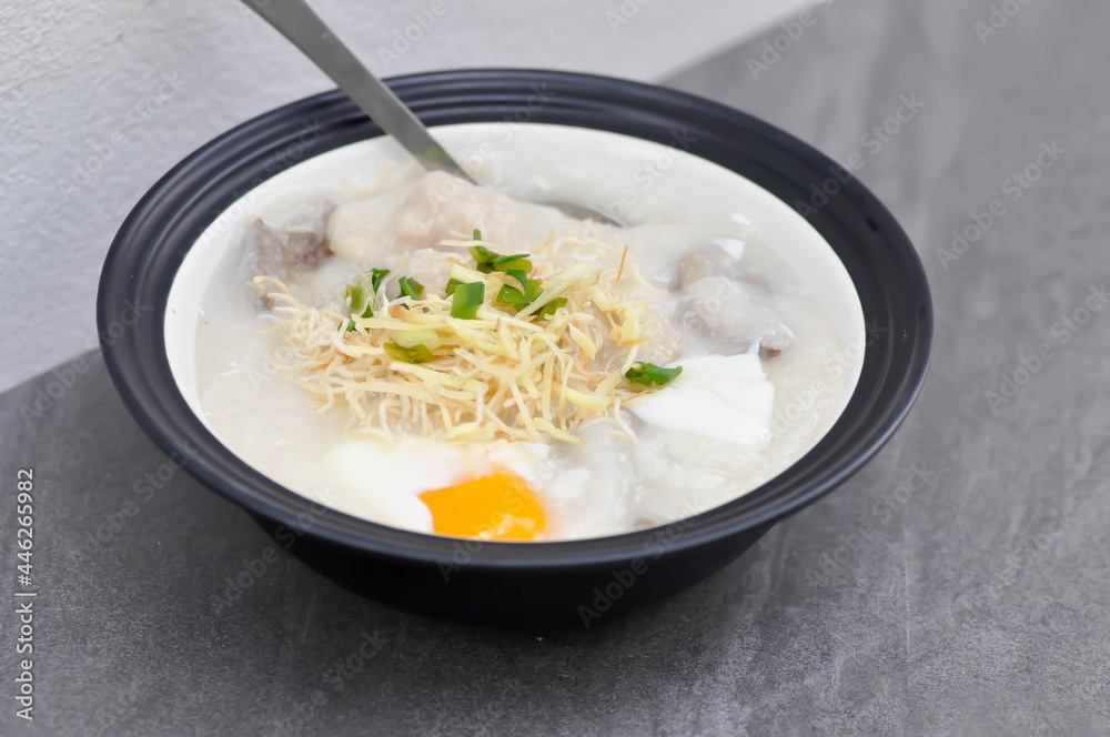 rice gruel, rice porridge or congee with pork liver and egg