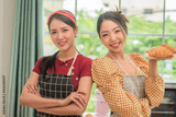Two women holding bread smile happy at home