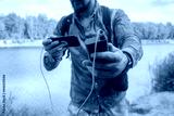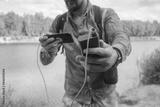 The guy is holding a portable charger with a smartphone in his hand. Man on a background of nature with a greenery and a lake