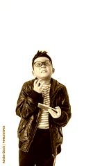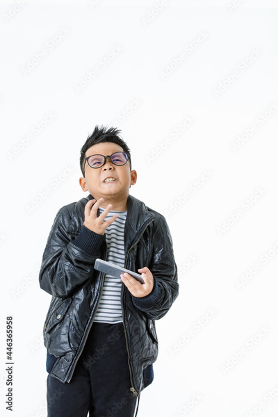 Funny cutout portrait of pity Asian boy wearing glasses and black jacket frown and tense his hand as disappointed, sad, and angry at unsatisfied failure of game playing on mobile phone