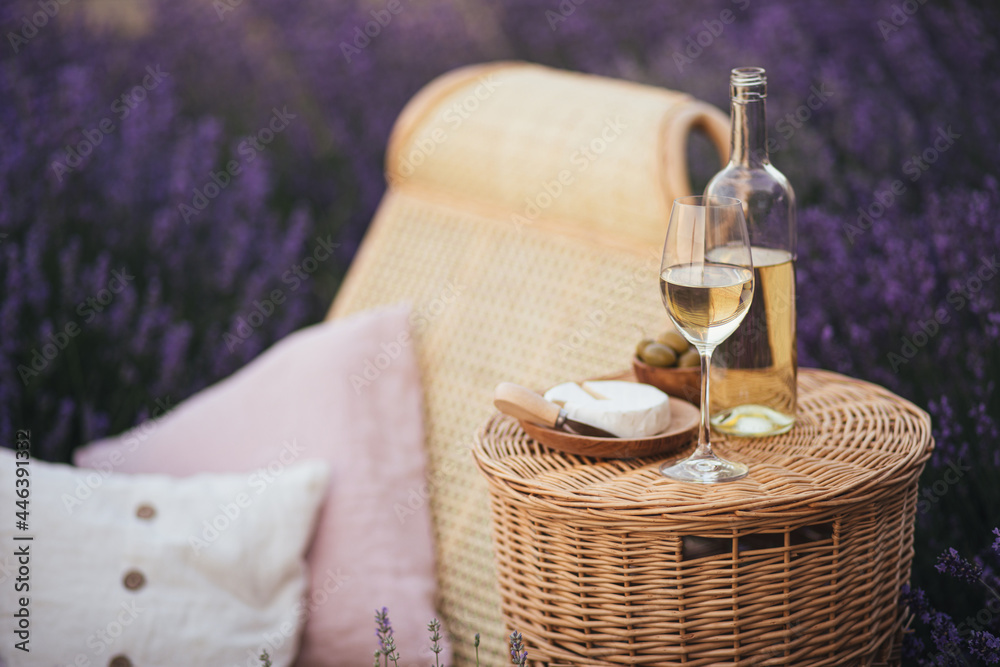 Wicker chair and table with glass of wine, fresh brie cheese and olives in lavender field.