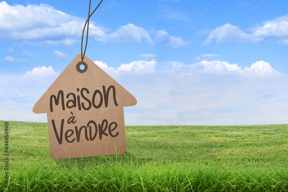 Maison à vendre, affichage, signalisation sur fond herbe et ciel bleu