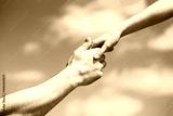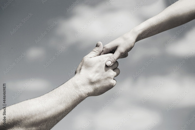 Solidarity, compassion, and charity, rescue. Giving a helping hand. Hands of man and woman on blue sky background. Lending a helping hand. Black and white