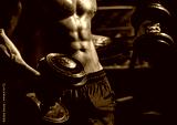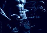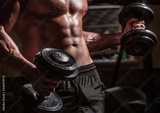 Abs and biceps. Muscular man with dumbell. Strong bodybuilder in the gym. Muscular man on gym background with dumbbell. Athlete in the gym training with dumbbells