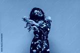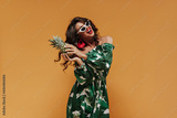 Joyful stylish woman with wavy hair and big lips in red earrings and printed summer clothes holding with pineapple and smiling..