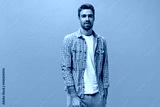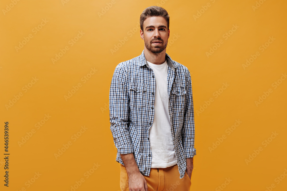 Serious young bearded man in orange pants, stylish checkered shirt and white t-shirt looks into camera and poses on orange background.