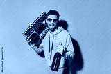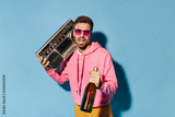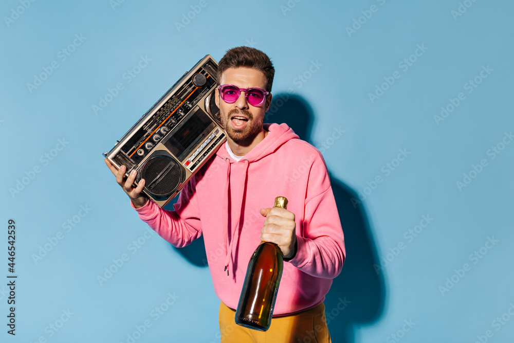 Young brunet bearded man in pink sunglasses and hoodie holds record player and champagne bottle on isolated blue background.