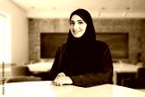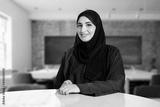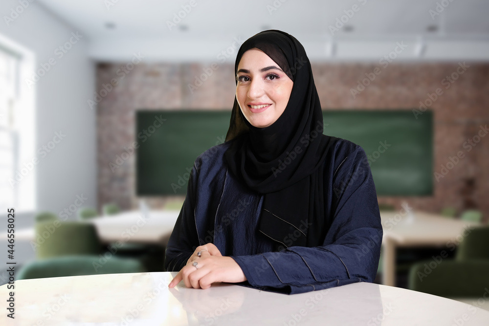Arabic teacher portrait inside the classroom. Emirati woman on Abaya Hijab