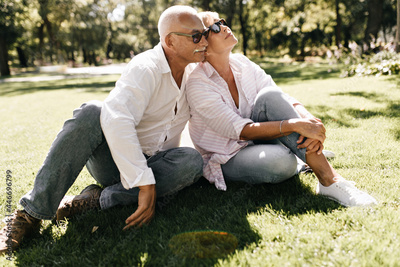 Handsome man with grey hair in long sleeve shirt and jeans sitting on grass with woman in striped hairstyle and jeans in park..