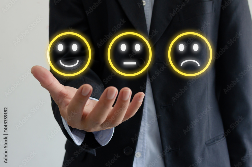 male hand with an emoticon.Customer ratings and service satisfaction.