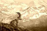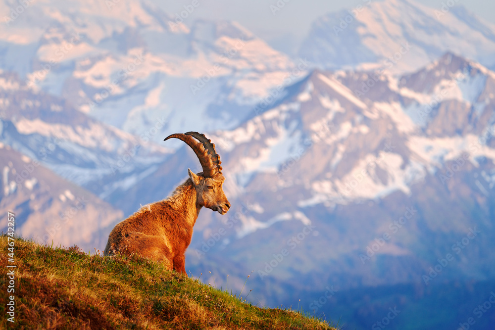 Switzerland wildlife. Ibex, Capra ibex, horned alpine animal with rocks in background, animal in the stone nature habitat, Alps. Evening orange sunset, wildlife nature.