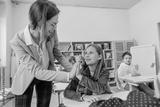 Female teacher helping schoolgirl pointing on something at her notebook