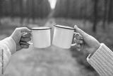 picking season, leisure and people concept - hands of man and woman clinking white tin tea mugs in forest