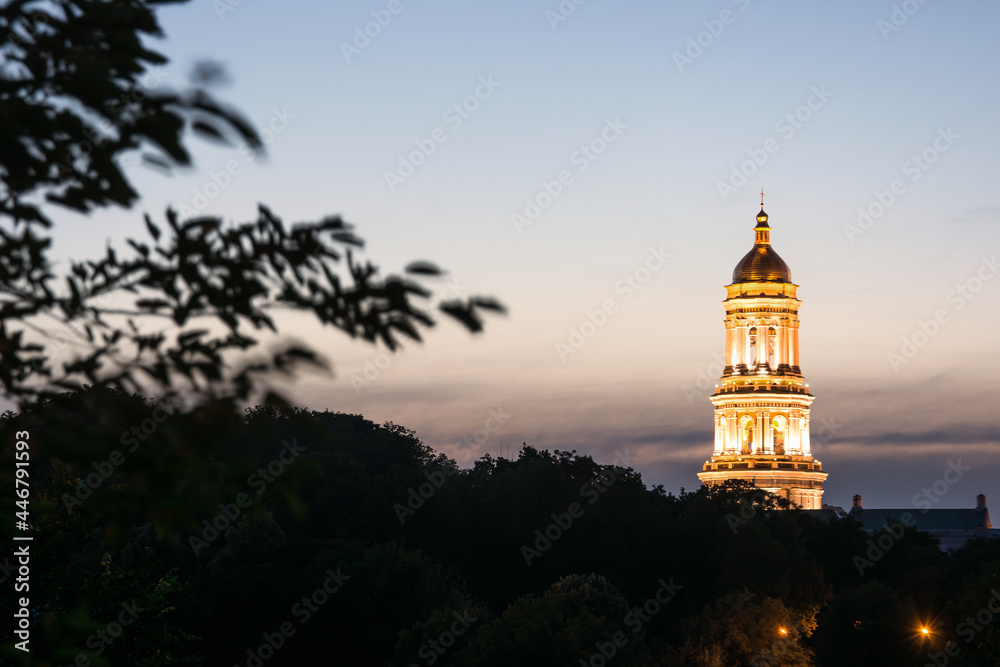 Nighttime cityscape view on Kyivo-Pechers’ka Lavra in Kiev, Ukraine. Night cityscape from heart of Kyiv.