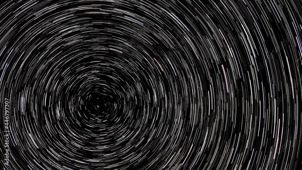 Startrails. Black and white star tails on the sky. Circular startrails. Startrails background. Polar star shot on long exposure.