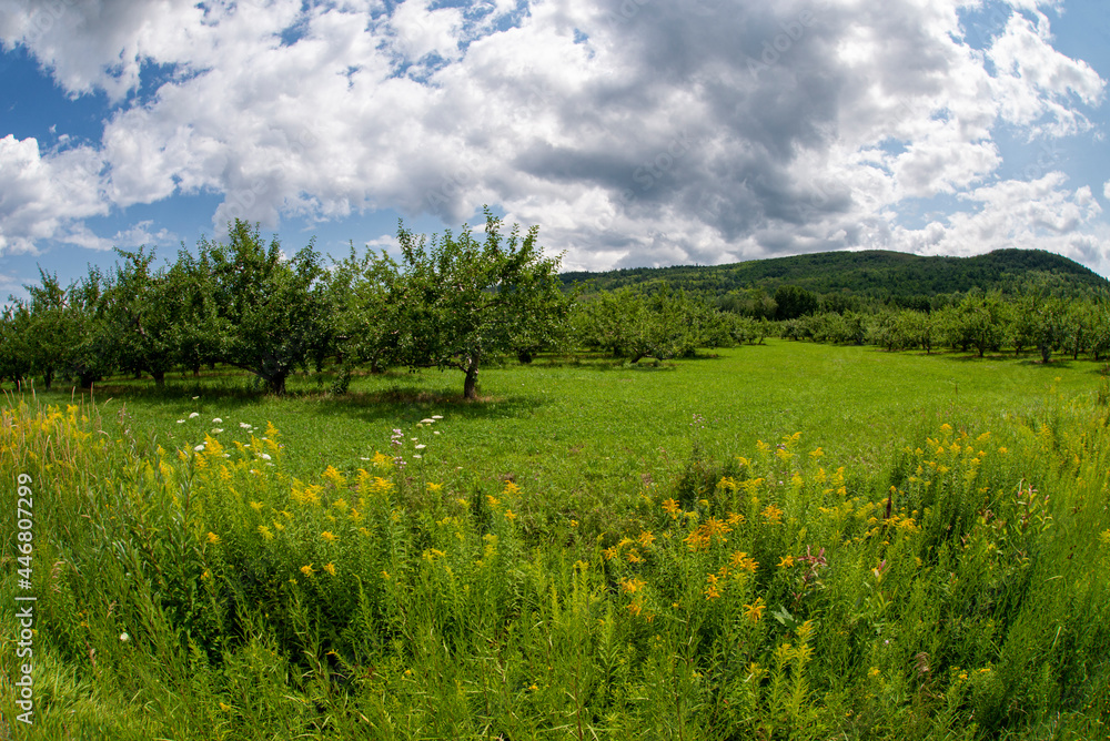 Apple orchard near wild flowers in summer.