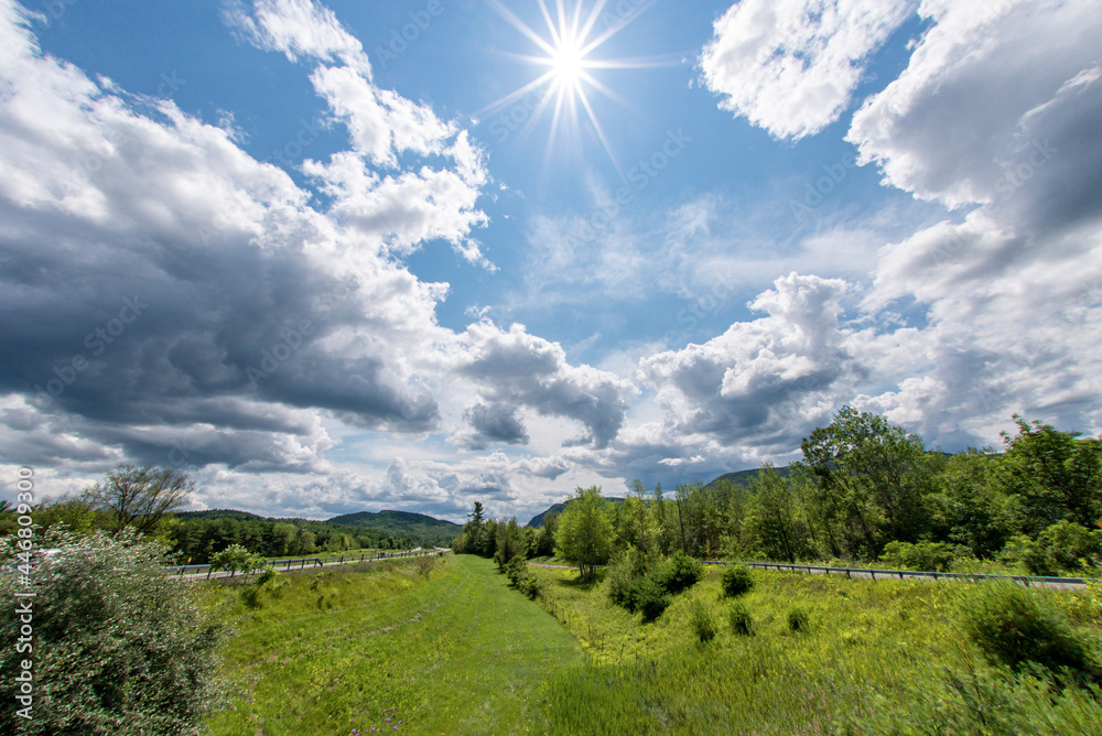 Summer scene in the Adirondacks with clouds surrounding the sun