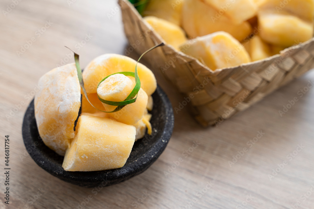 tapai or tape or peuyeum are traditional foods snacks from indonesia, made from fermented cassava. selective focus