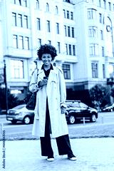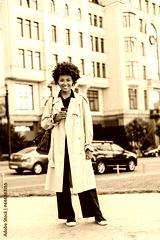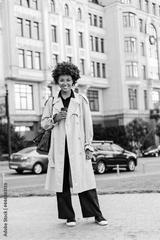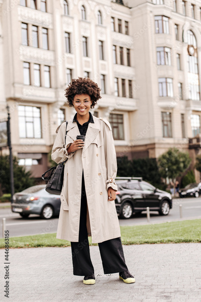Full-length portrait of attractive brunette curly dark-skinned woman in black pants, oversized beige trench coat and eyeglasses smiling and holding coffee cup outside.