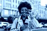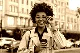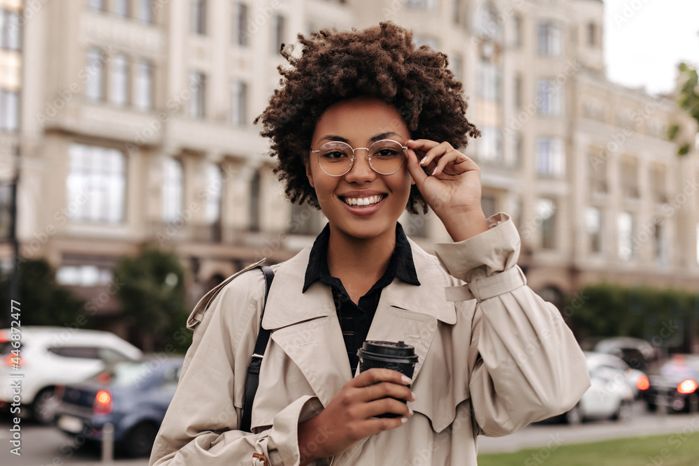 Cheerful happy brunette curly dark-skinned woman in beige trench coat puts on round eyeglasses and holds coffee cup outside.
