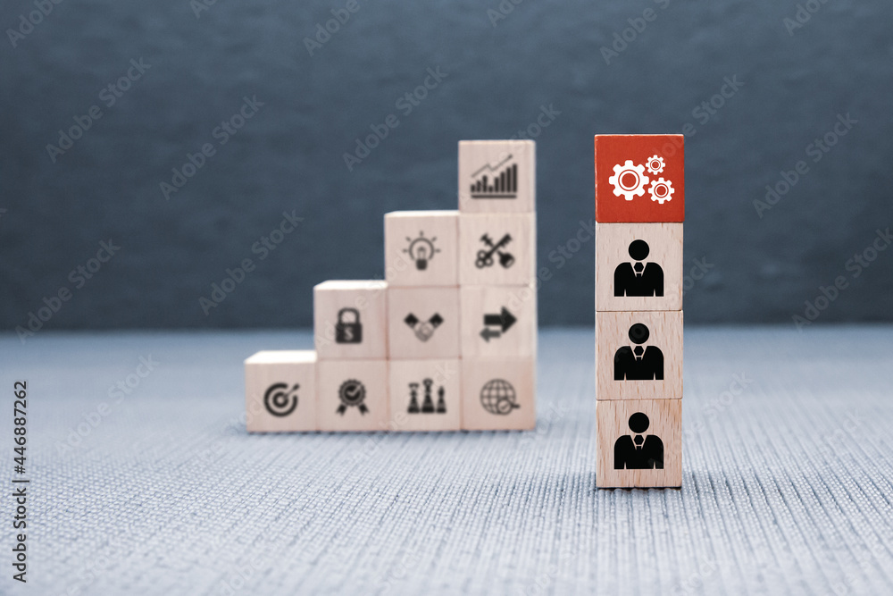 People with cog icon on cube wooden toy block stack. Concepts of business team creative thinking and human resources for personnel leader and teamwork or leadership team player is performance.