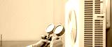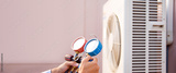 Air condition mechanic using manifold gauge for filling home air conditioner and checking maintenance and repair outdoor air compressor unit.