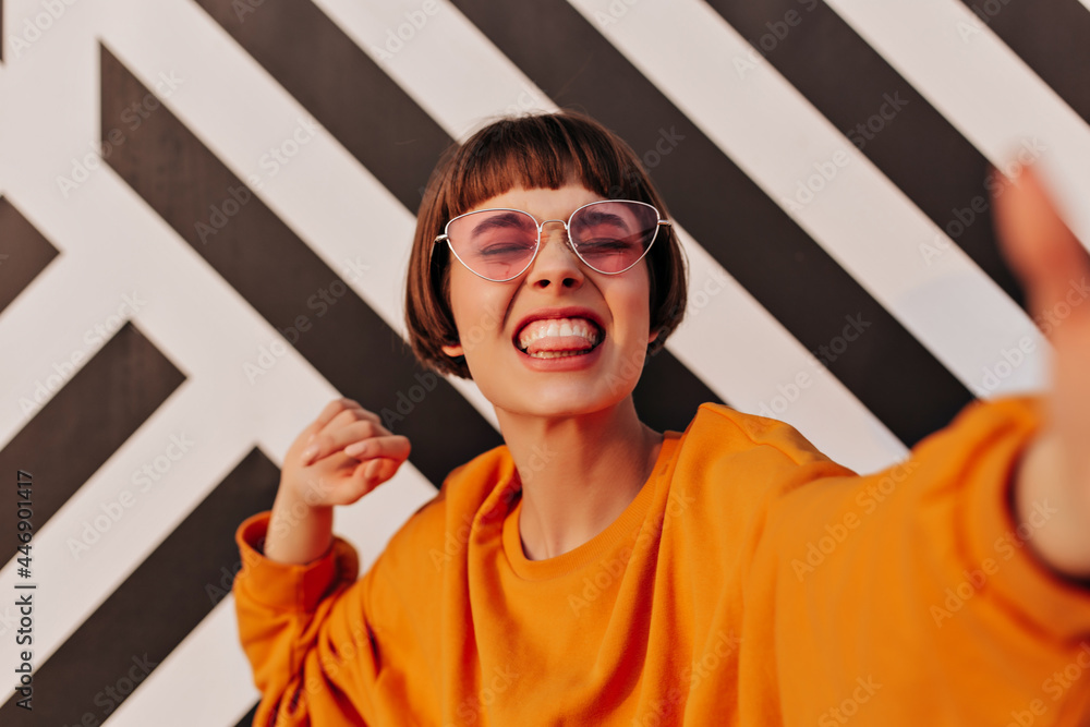 Emotional woman with short hairstyle in pink glasses showing tongue on striped backdrop. Modern girl in orange sweatshirt makes funny face outside..