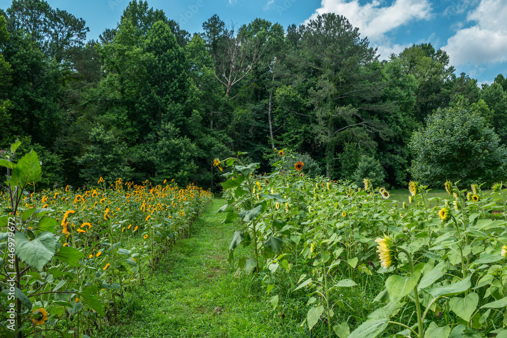Variety of sunflowers in a field