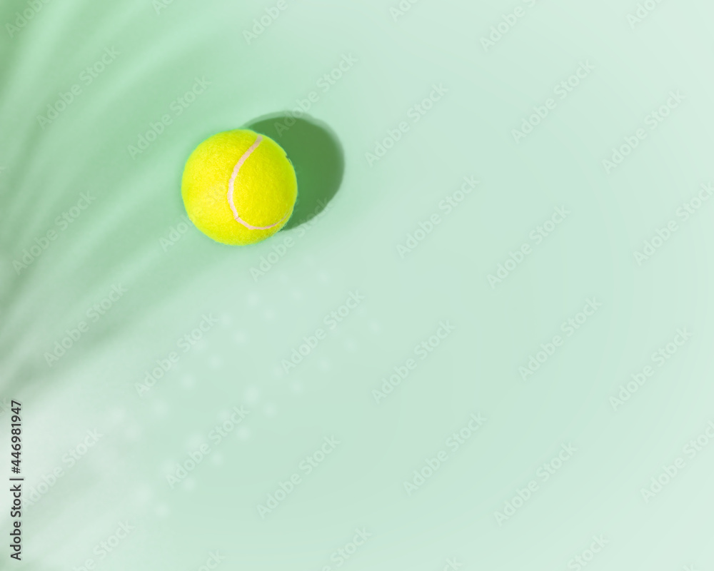Tennis. Sport, horizontal composition with yellow tennis ball and palm leave shadow on mint background with place for text. Flat lay