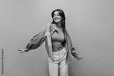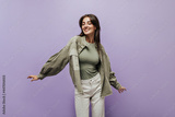 Happy dark haired woman in olive t-shirt, modern jacket and light pants smiling and posing with closed eyes on isolated backdrop.
