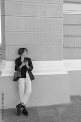 Fashionable woman in white pants, black jacket and boots posing outdoors. Brunette girl with handbag and glasses holds phone outside..