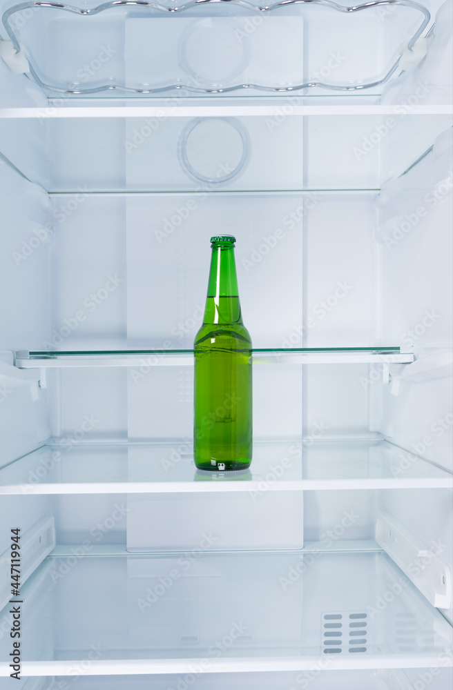 a bottle of beer in the refrigerator, on the shelf, on a white background