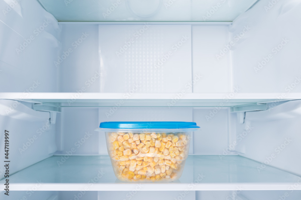 corn kernels in a plastic container, standing on the shelf of the refrigerator, on a white background