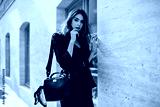 Engaging young lady with brunette wavy hair, bright makeup, dark modern outfit and black bag on shoulder, thoughtfully posing near beige sunlit wall outdoors