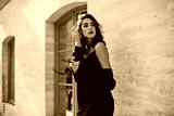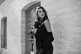 Cute young girl with dark wavy hairstyle and bright makeup, silk dress, black jacket, holding sunglasses in hands and looking away against beige building background