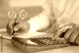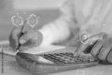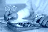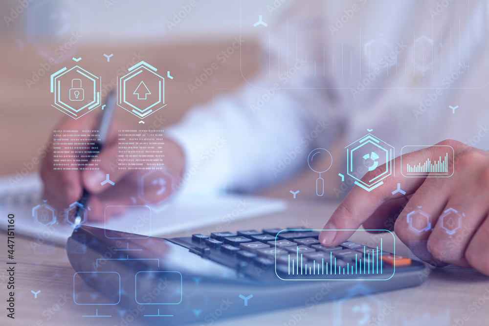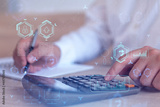 A research and development specialist computing the data to create a new approach to develop high tech business. Technological icons over the desk with calculator.